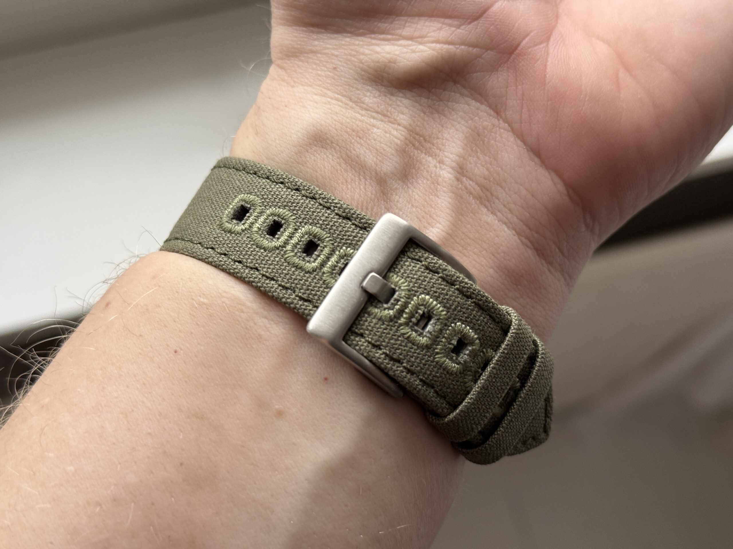 Canvas band med bandstift av ”quick release”-typ där verktyg inte krävs för byte av band. Vadderat och med läder på baksidan.