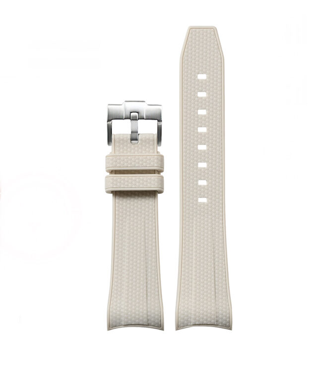 Klockband av gummi. Mjukt och följsamt. Bandet har ”curved ends” (böjda ändar) för att sluta tätt mot boetten.