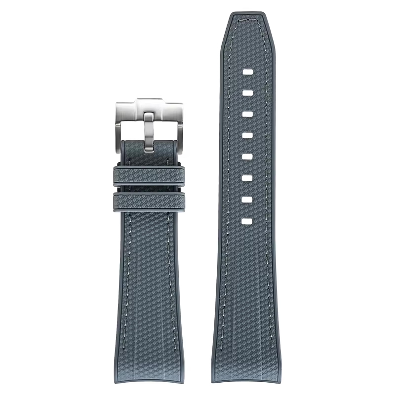 Klockband av gummi. Mjukt och följsamt. Bandet har ”curved ends” (böjda ändar) för att sluta tätt mot boetten.