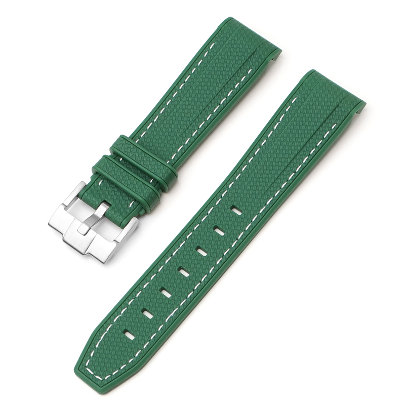 Klockband i gummi. Mjukt och följsamt. Bandet har ”curved ends” (böjda ändar) för att sluta tätt mot boetten.