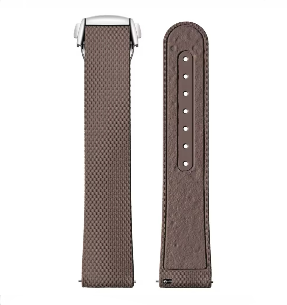 Ett slitstarkt klockarmband av FKM-gummi. Undersidan har en kratermönstrad textur som återger månens yta – både ventilerande och behaglig mot handleden. Det är 100 % vattentätt, mjukt mot handleden och utrustat med ett bekvämt polerat viklås.
