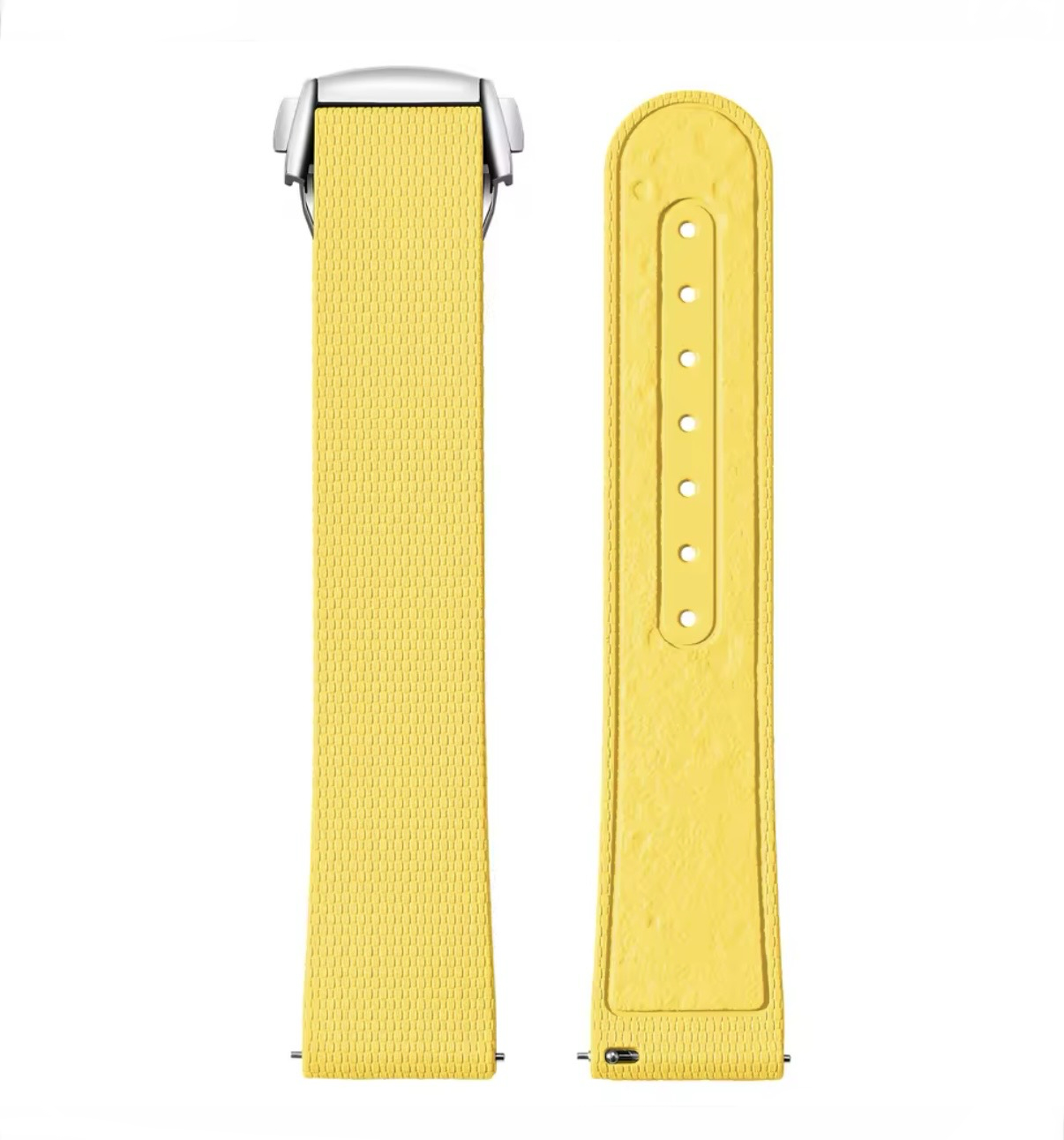 Ett slitstarkt klockarmband av FKM-gummi. Undersidan har en kratermönstrad textur som återger månens yta – både ventilerande och behaglig mot handleden. Det är 100 % vattentätt, mjukt mot handleden och utrustat med ett bekvämt polerat viklås.