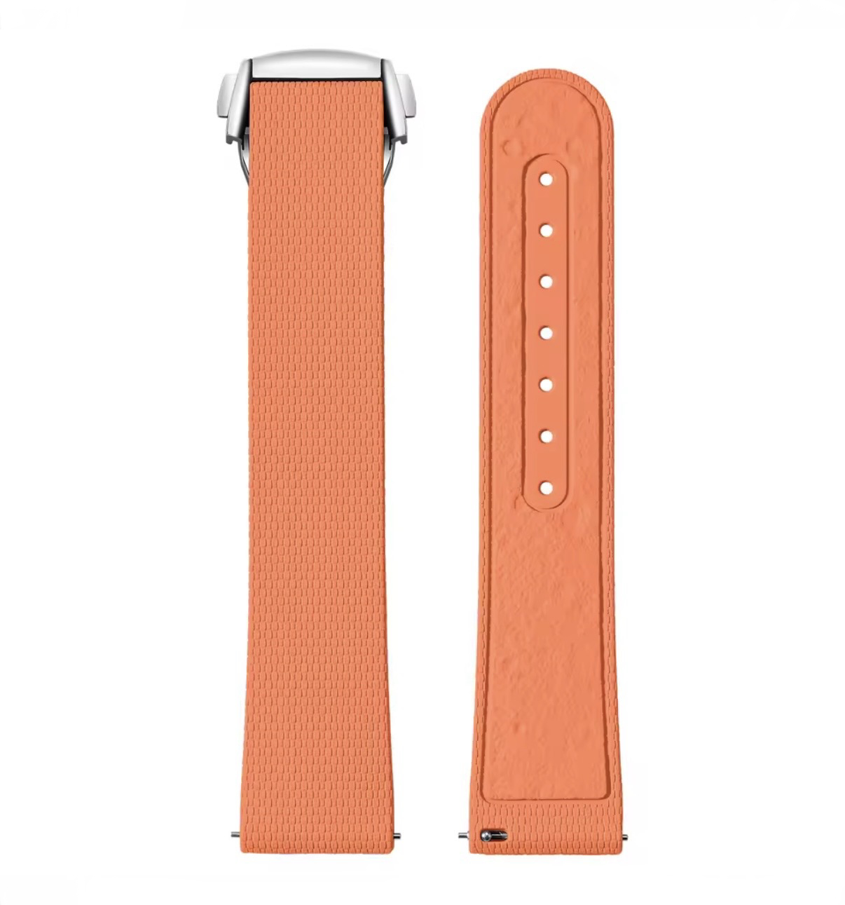 Ett slitstarkt klockarmband av FKM-gummi. Undersidan har en kratermönstrad textur som återger månens yta – både ventilerande och behaglig mot handleden. Det är 100 % vattentätt, mjukt mot handleden och utrustat med ett bekvämt polerat viklås.