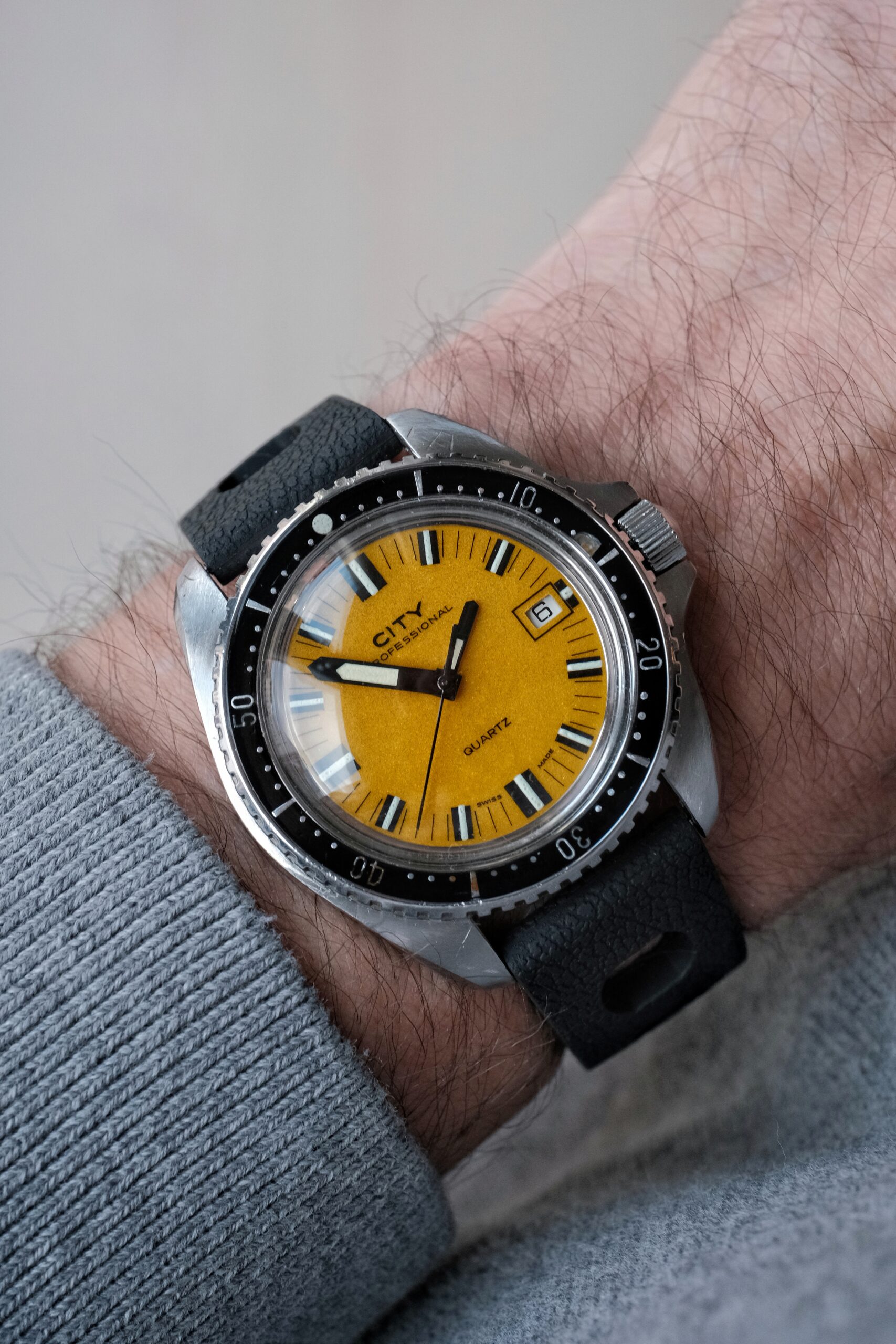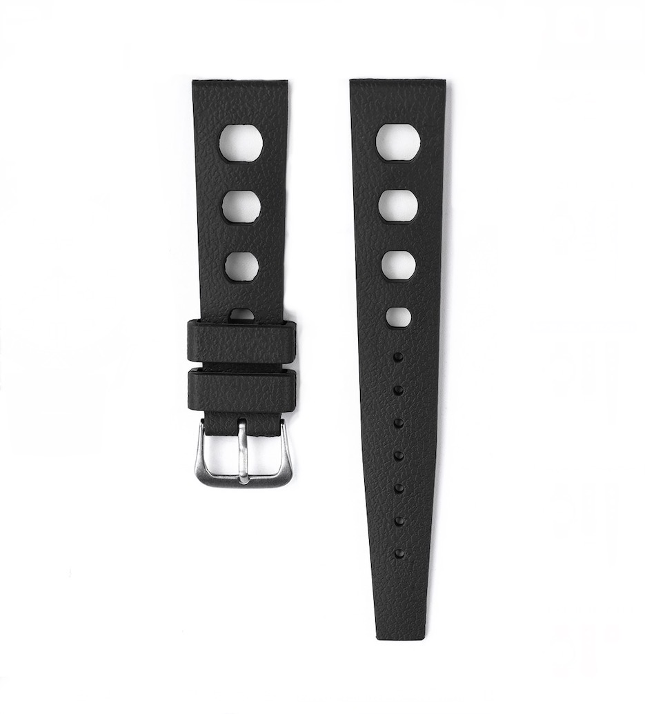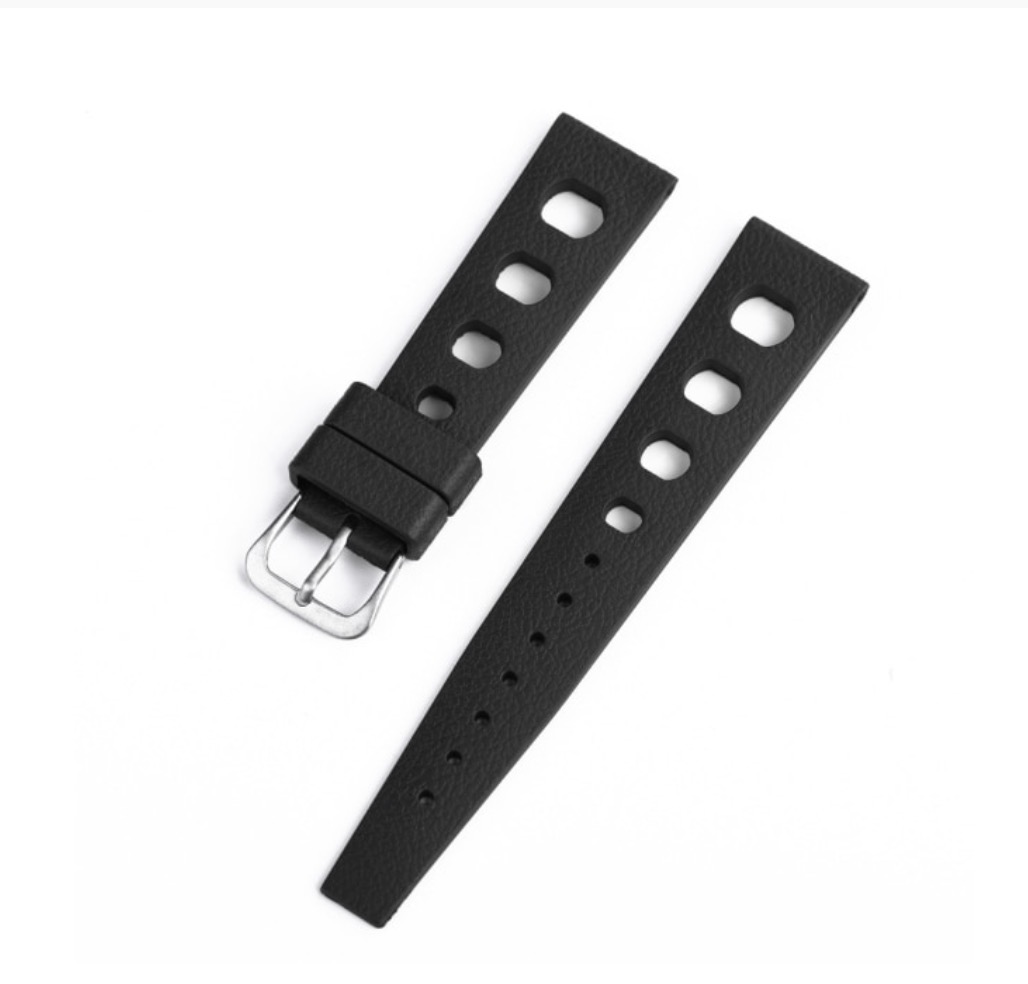 Klockband i FKM-gummi. Mjukt och följsamt. Det är “quick release”-bandstift på denna modell, dvs inget verktyg krävs för byte av band.