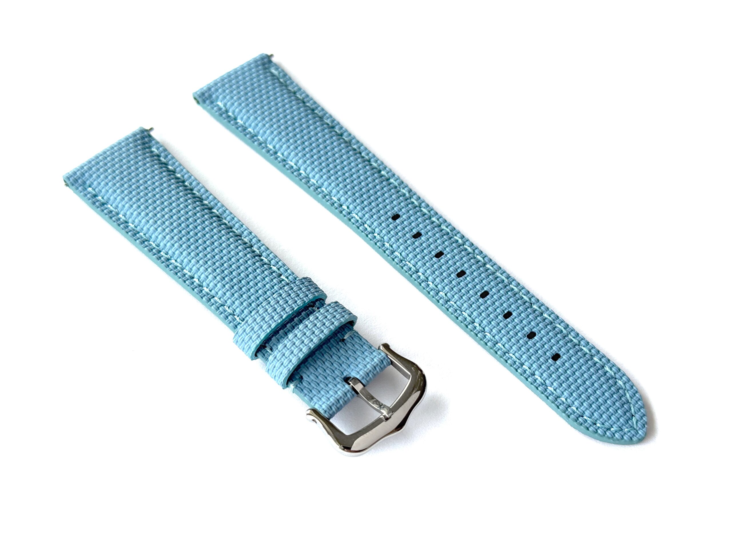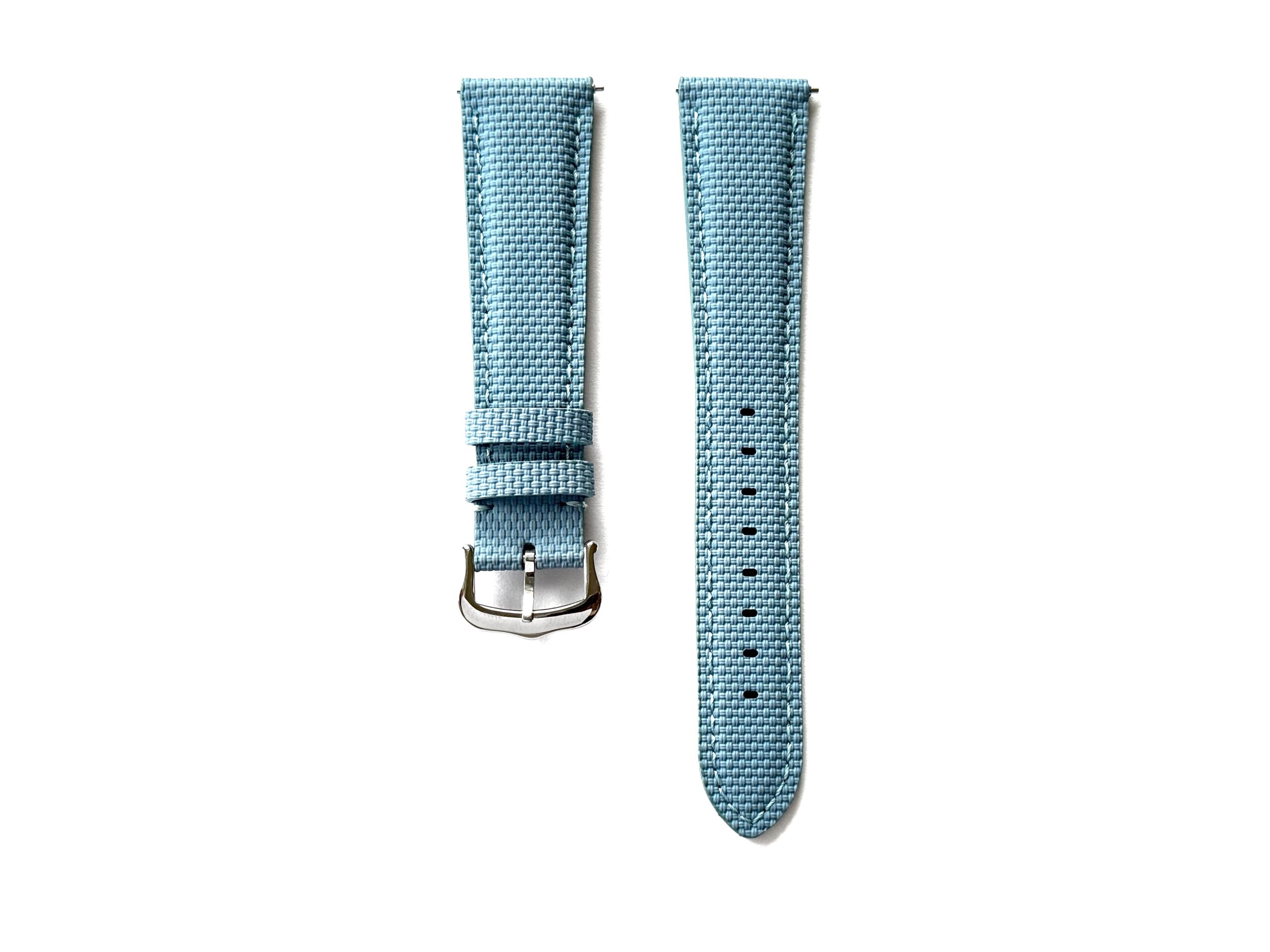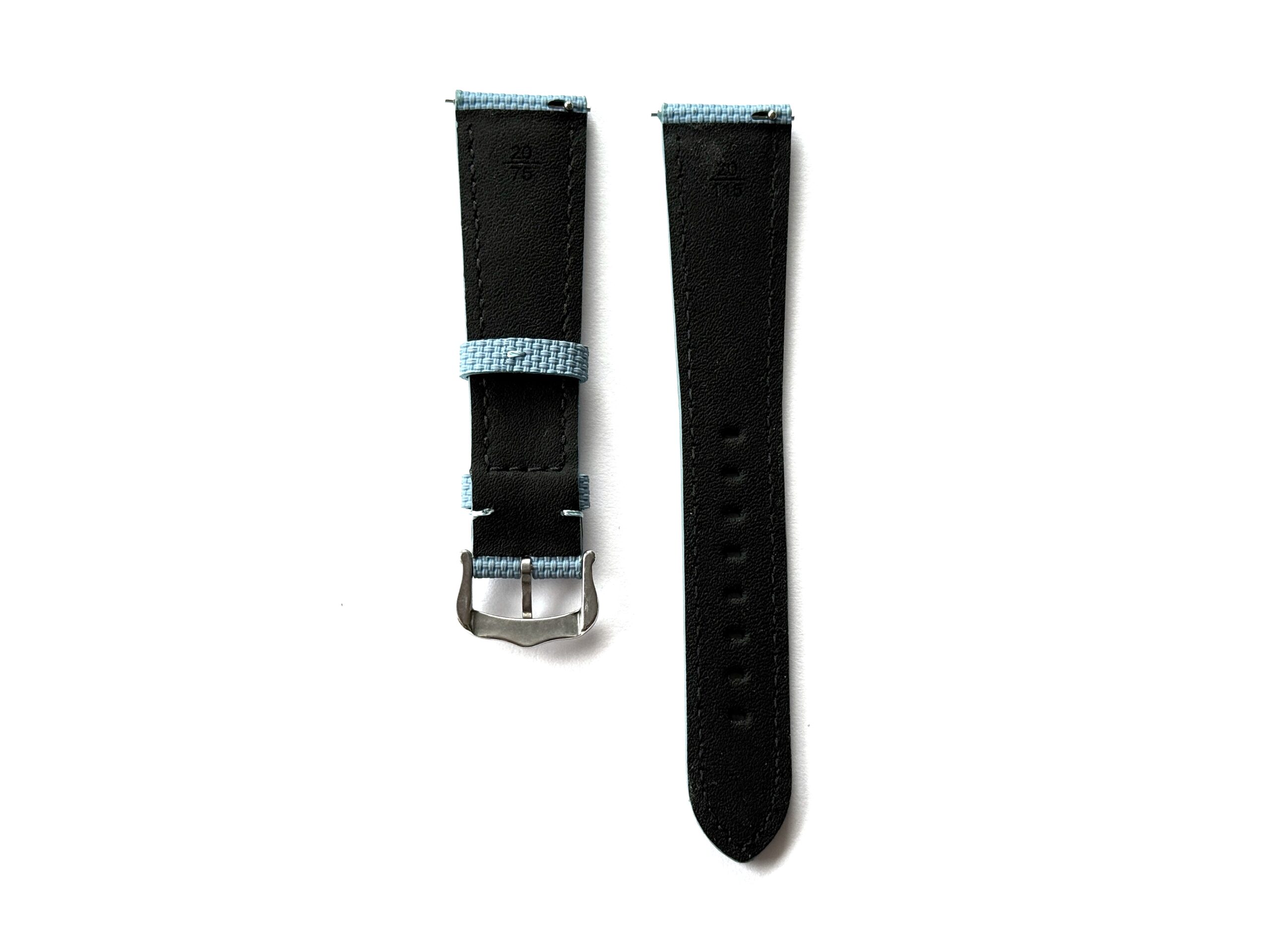 Detta klockarmband kombinerar den eleganta strukturen från segelduk med den slitstarka flexibiliteten hos premium FKM-gummi. Det är 100 % vattentätt, mjukt mot handleden och utrustat med ett polerat spänne. Även undersidan av denna modell är av gummi.