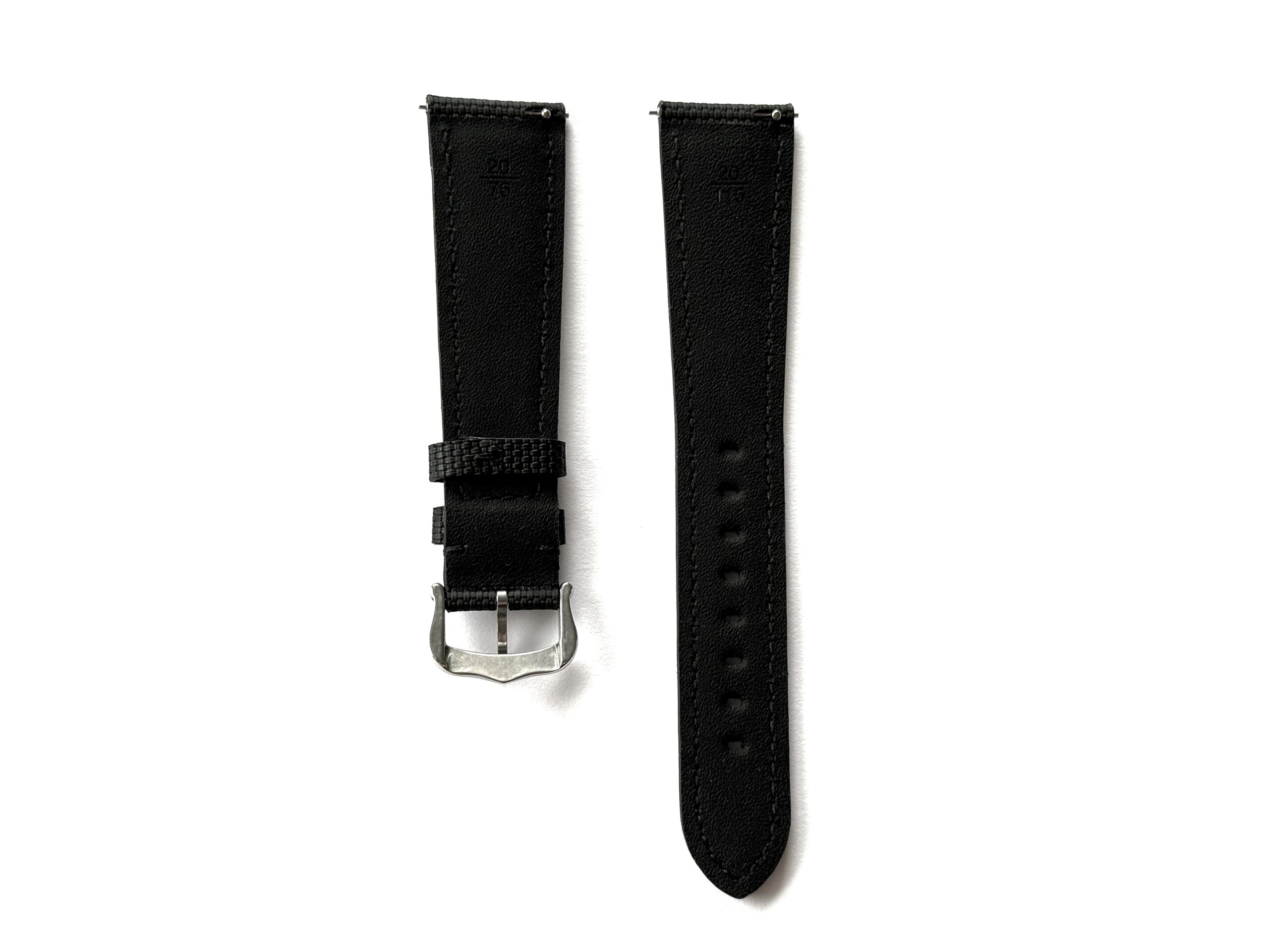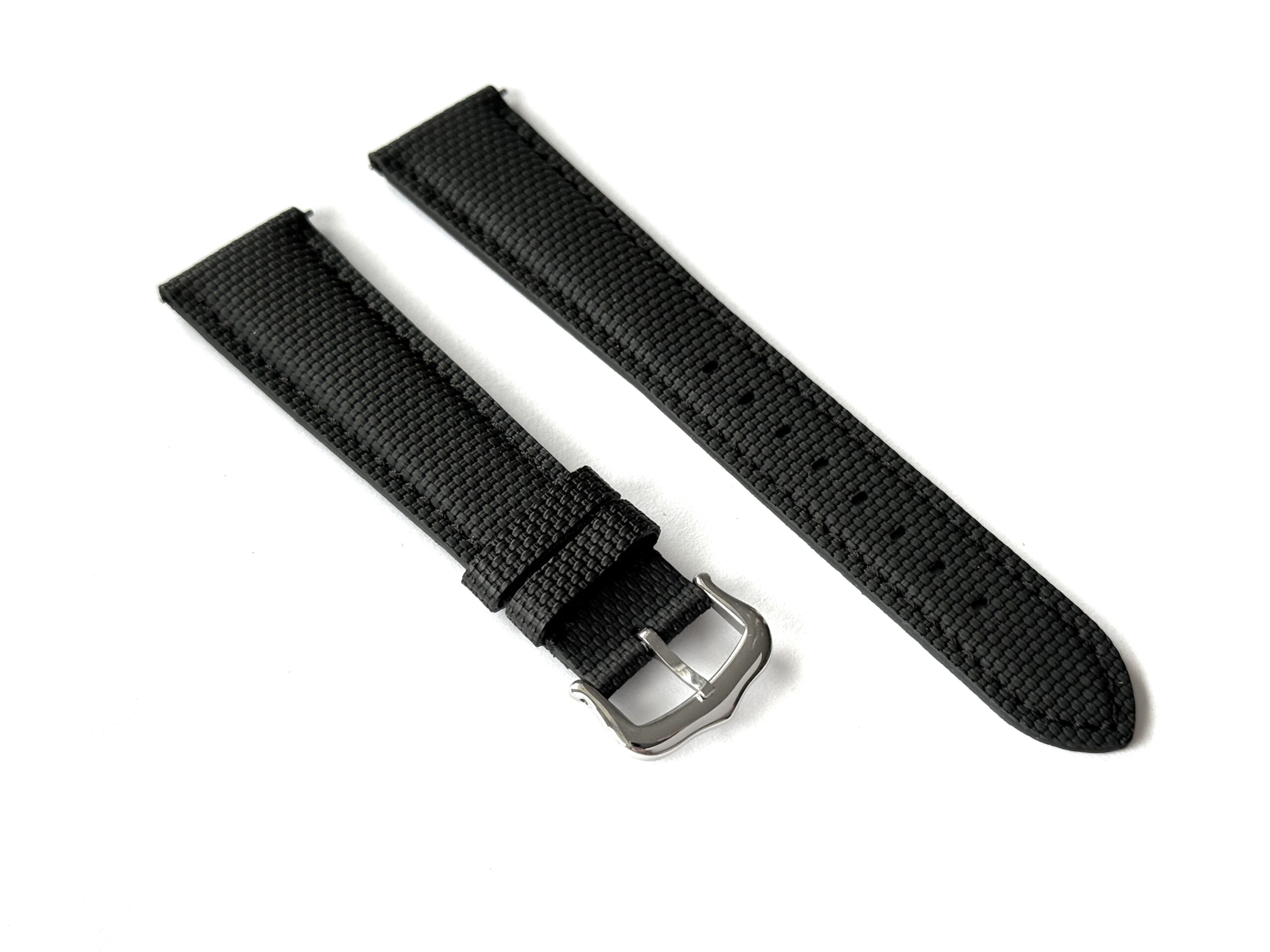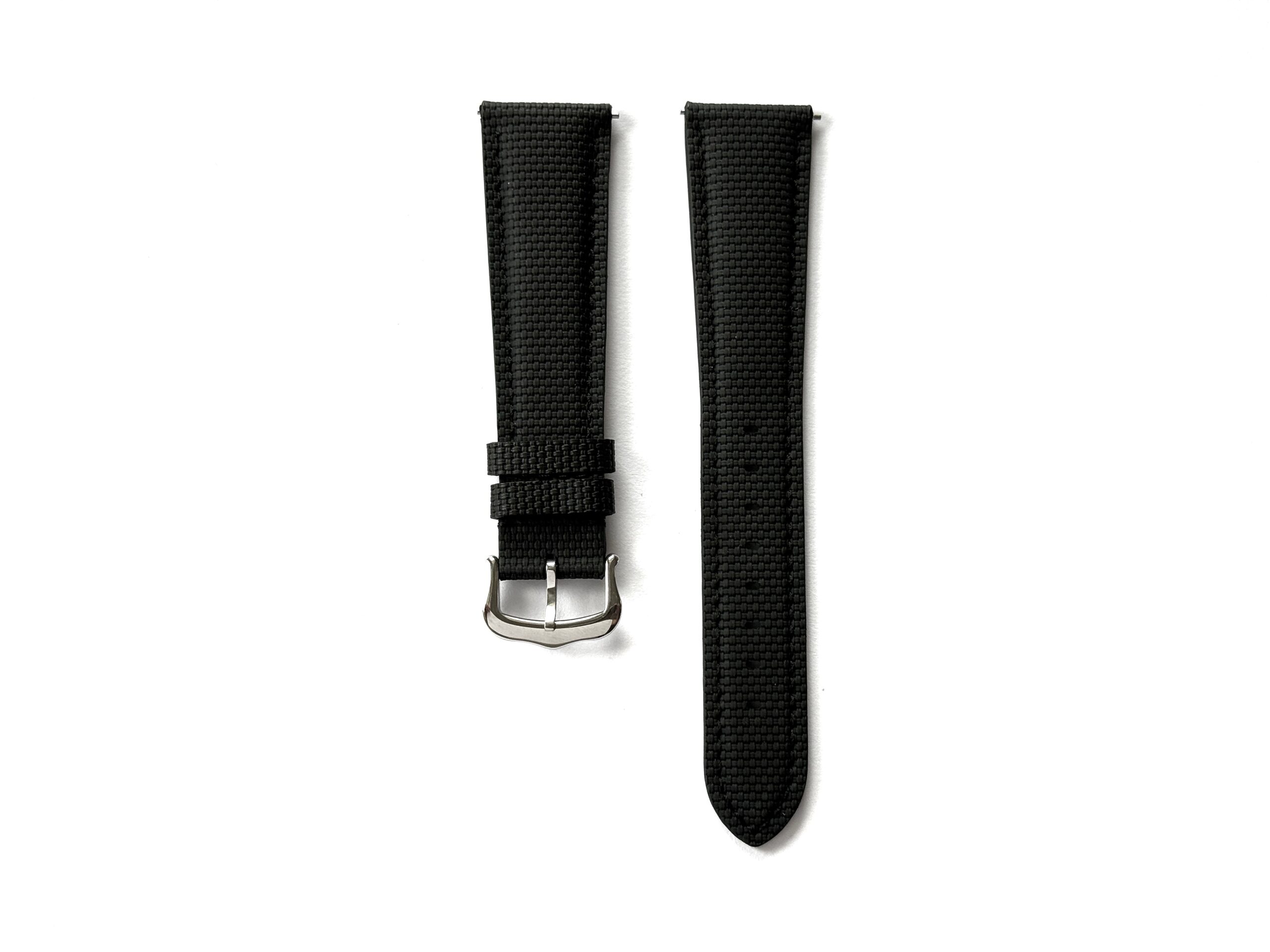 Detta klockarmband kombinerar den eleganta strukturen från segelduk med den slitstarka flexibiliteten hos premium FKM-gummi. Det är 100 % vattentätt, mjukt mot handleden och utrustat med ett polerat spänne. Även undersidan av denna modell är av gummi.